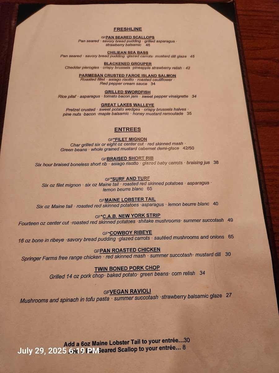 Six ounce filet mignon, five to six ounce Maine tail, roasted yukon gold potatoes, asparagus, lemon beurre blanc